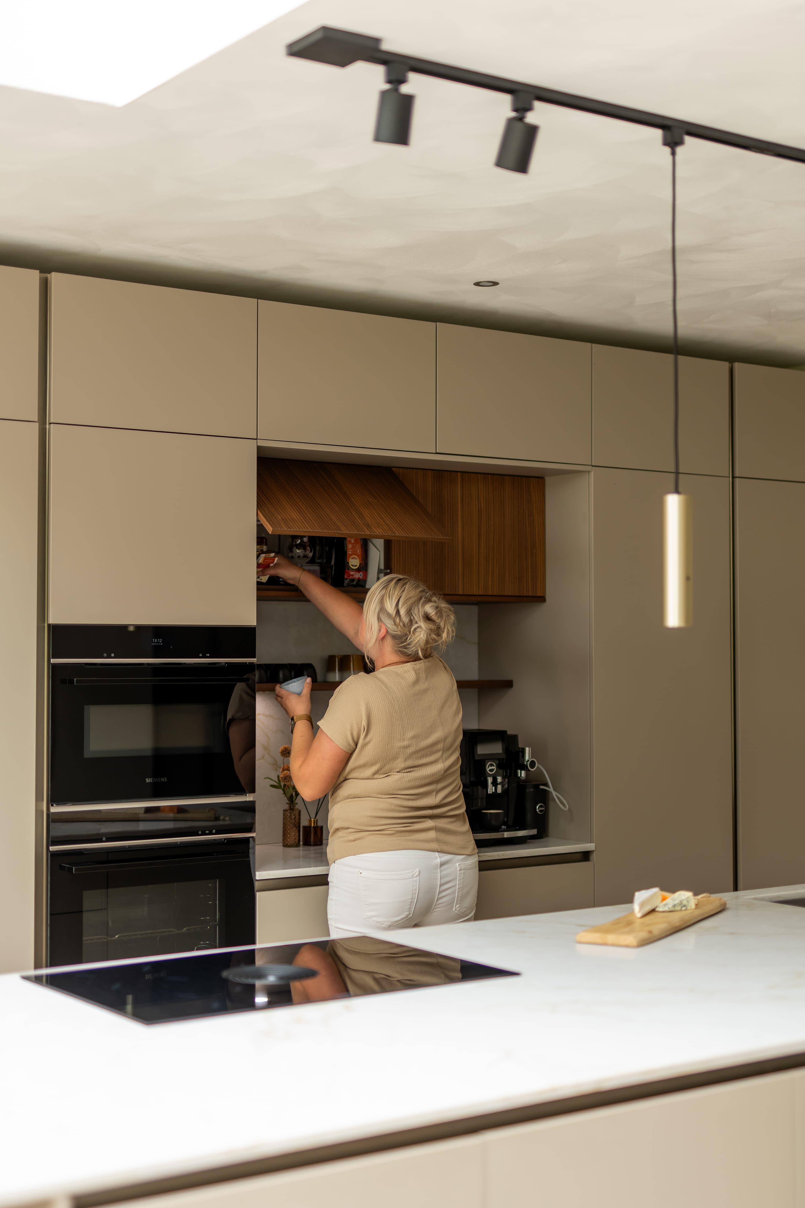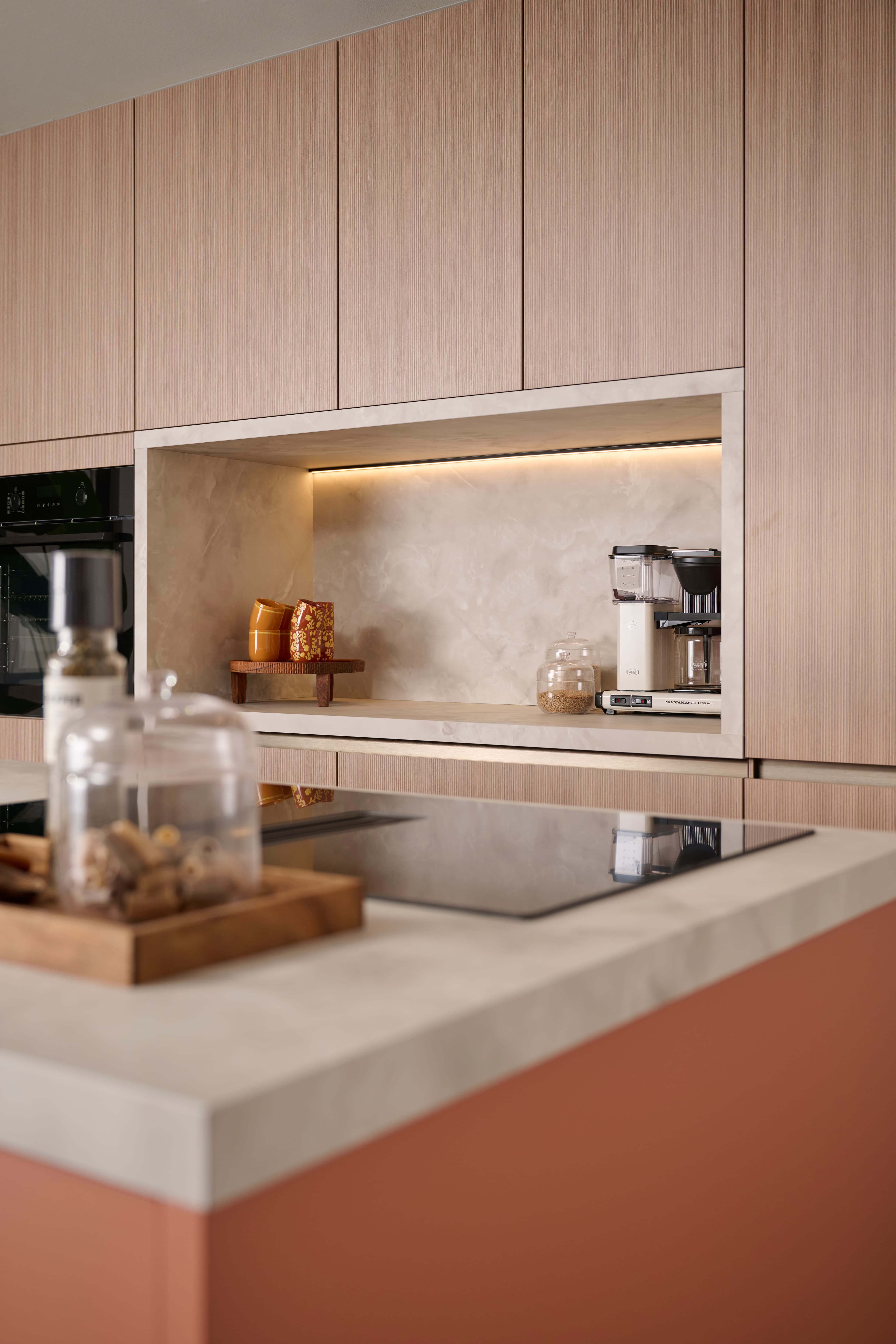 Stylingtip: bekleed de nis met een warme kleur, houtfineer of een subtiele tegel en voeg een plankje toe voor je mooiste kopjes of koffiepotten.